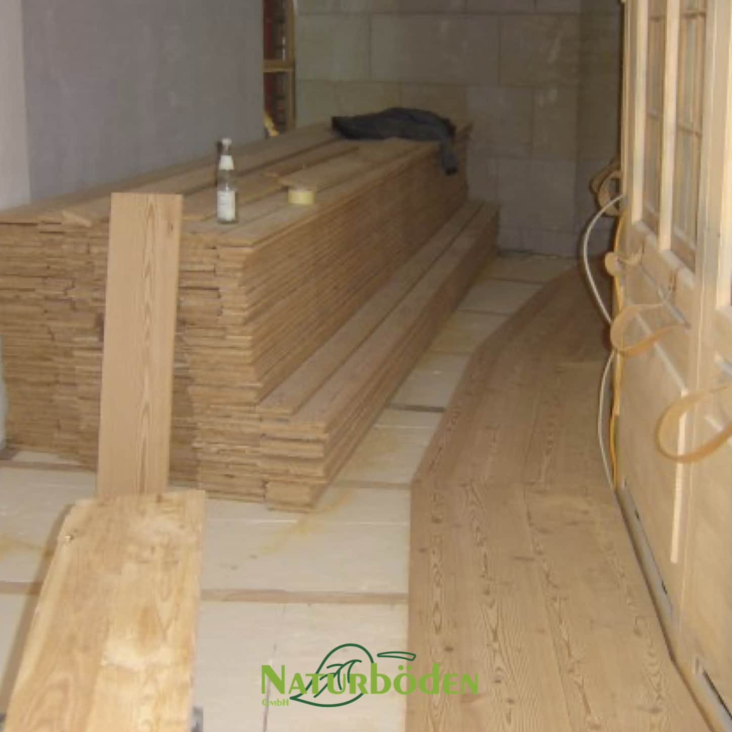 Edles Lärchenholz für Langlebigkeit und warme Akustik, passend zur historischen Rekonstruktion – eine vorsichtige Sortierung vor der Verlegung sorgt für ein ästhetisch perfektes Ergebnis.