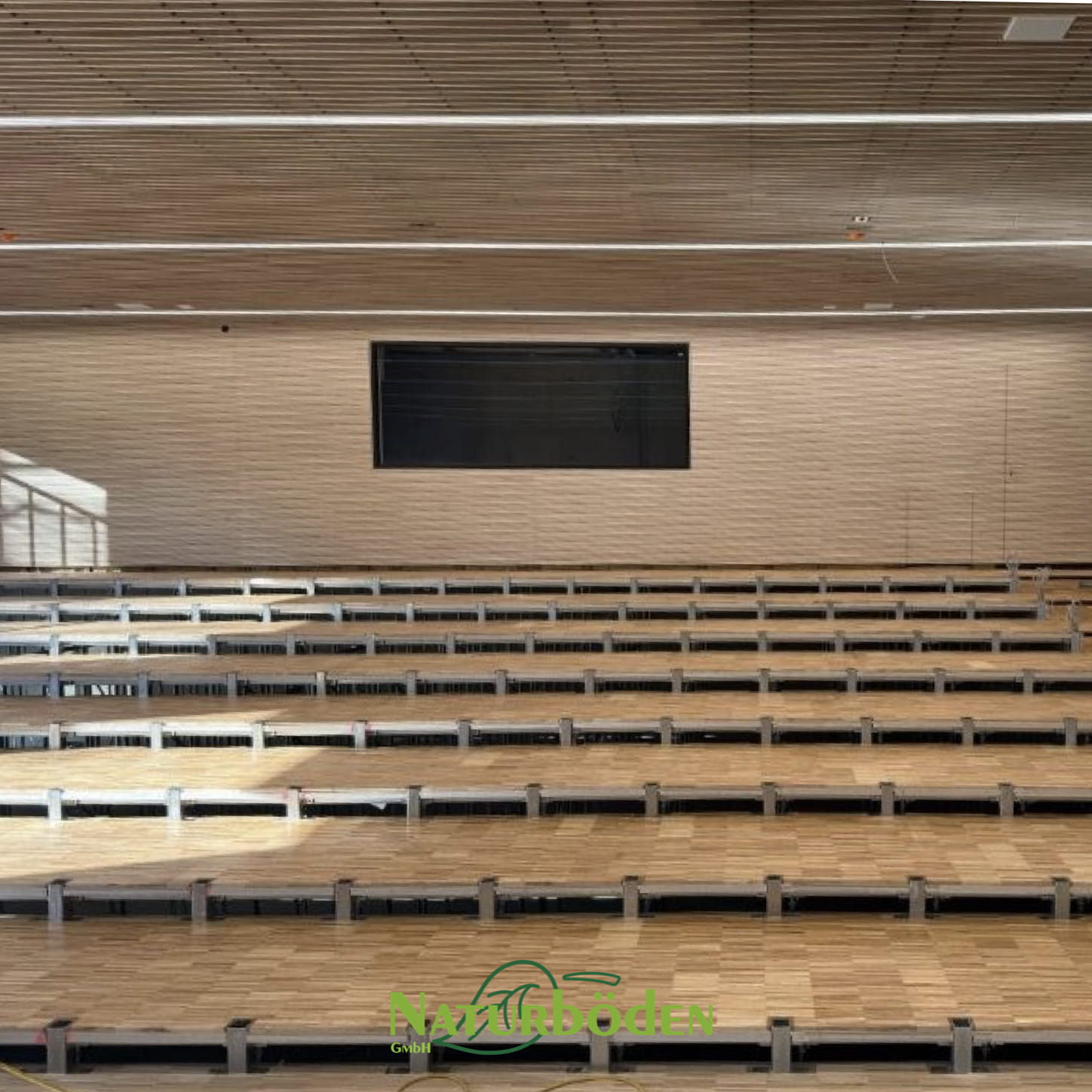 Verlegung eines hochwertigen HKL-Esche-Belags auf ca. 5000 m² Hohlboden-System. Der Bestandsuntergrund wurde vollständig mit Spezialspachtelmasse bearbeitet – von der Ausgleichsspachtelung bis zu partiellen Höhenanpassungen von bis zu 20 mm. Abschließend wurden die Treppenstufen mit 5 mm starkem Dickfurnier in Räuchereiche gefertigt und millimetergenau an die neue Bodenhöhe angepasst – als bewusster dunkler Akzent zur hellen Hauptfläche.